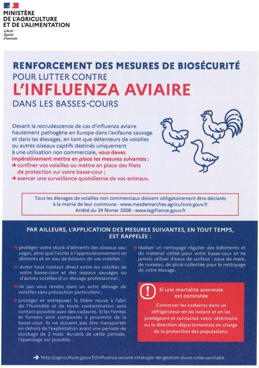 Relèvement du niveau de risque de modéré à élevé vis-à-vis de l’influenza aviaire et conséquences pour Caix